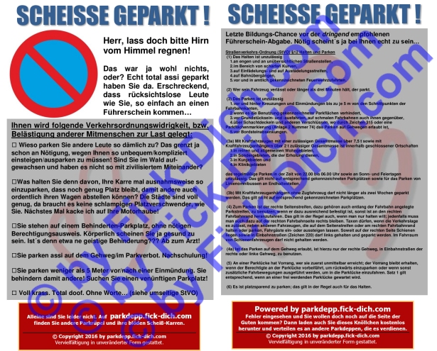 Für diesen Personenkreis gibt es ein spezielles Knöllchen. Wer ganz besonders assi parkt, hat den Hauptgewinn und wird hier auf der Seite vorgestellt. Natürlich hat der Falschparker dann auch Gelegenheit, sich im jeweiligen Beitrag zu äußern. Auf die Argumentation so manchen Parkdeppens kann man gespannt sein.